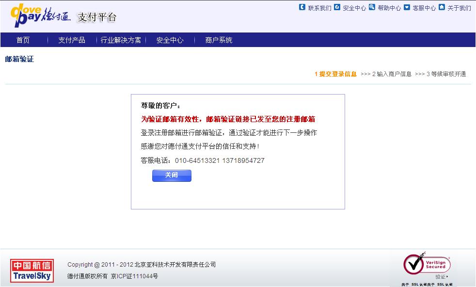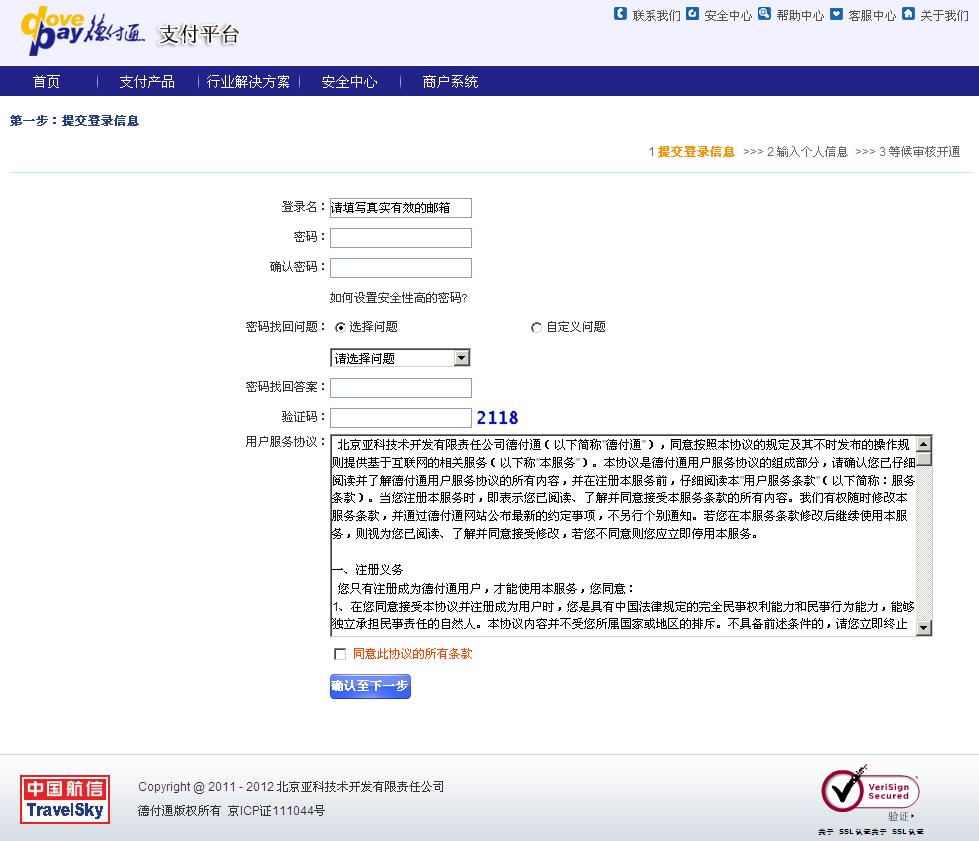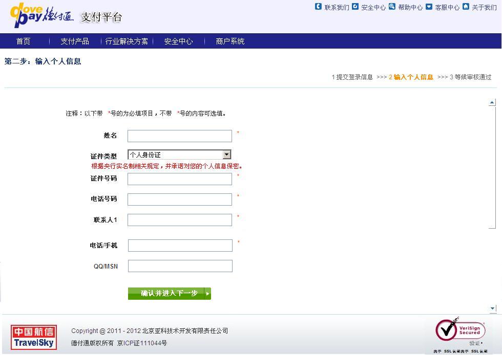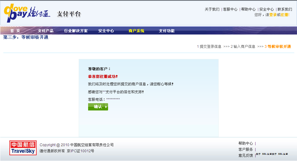 商户将相关信息填写完毕,并加盖公章后,将其与营业执照副本复印件(加盖公章)或个人身份证复印件、网站资质证明复印件(加盖公章)等资料一起递送给支付平台,支付平台完成相关资料的采集、审核、确认之后,将通知商户注册成功,并同时开通相应的各项业务功能。